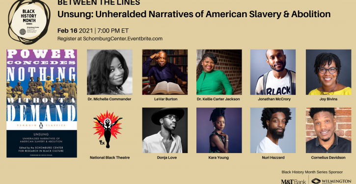 On Tuesday, February 16th, 7-8:30 pm, join us for the launch of Unsung: Unheralded Narratives of American Slavery & Abolition, a comprehensive collection “that should be required reading in history and literature courses,” writes Kirkus Reviews. Edited by Dr. Michelle Commander, associate director and curator of the Lapidus Center, with a foreword by former Schomburg Center Director Kevin Young, this new anthology weaves together well- and lesser-known documents by abolitionists and highlights materials from Arturo Schomburg’s seed collection. Unsung is the first in a series of upcoming anthologies from the Schomburg Center published in partnership with Penguin Classics.